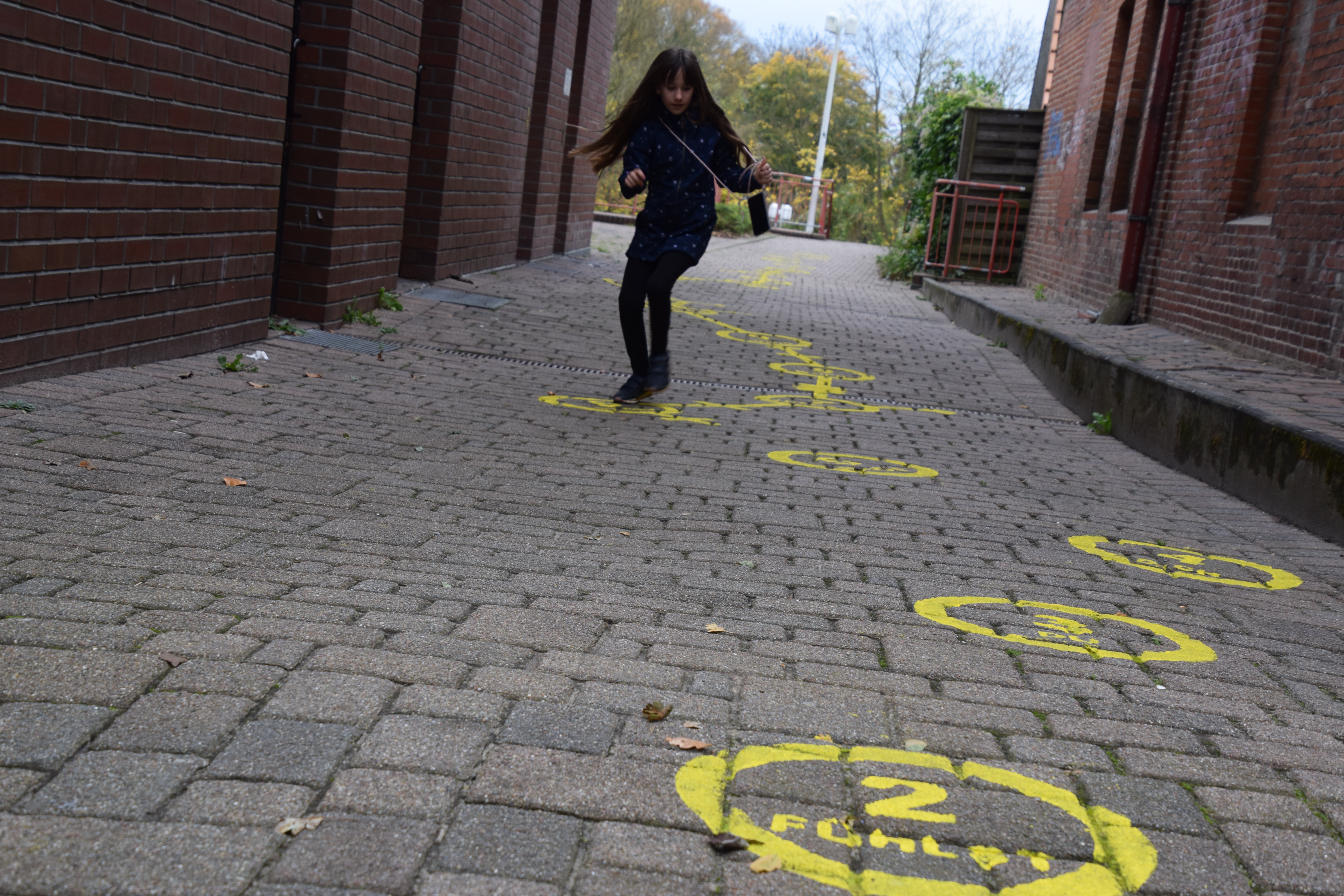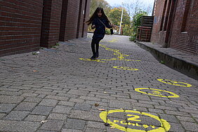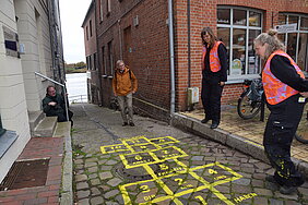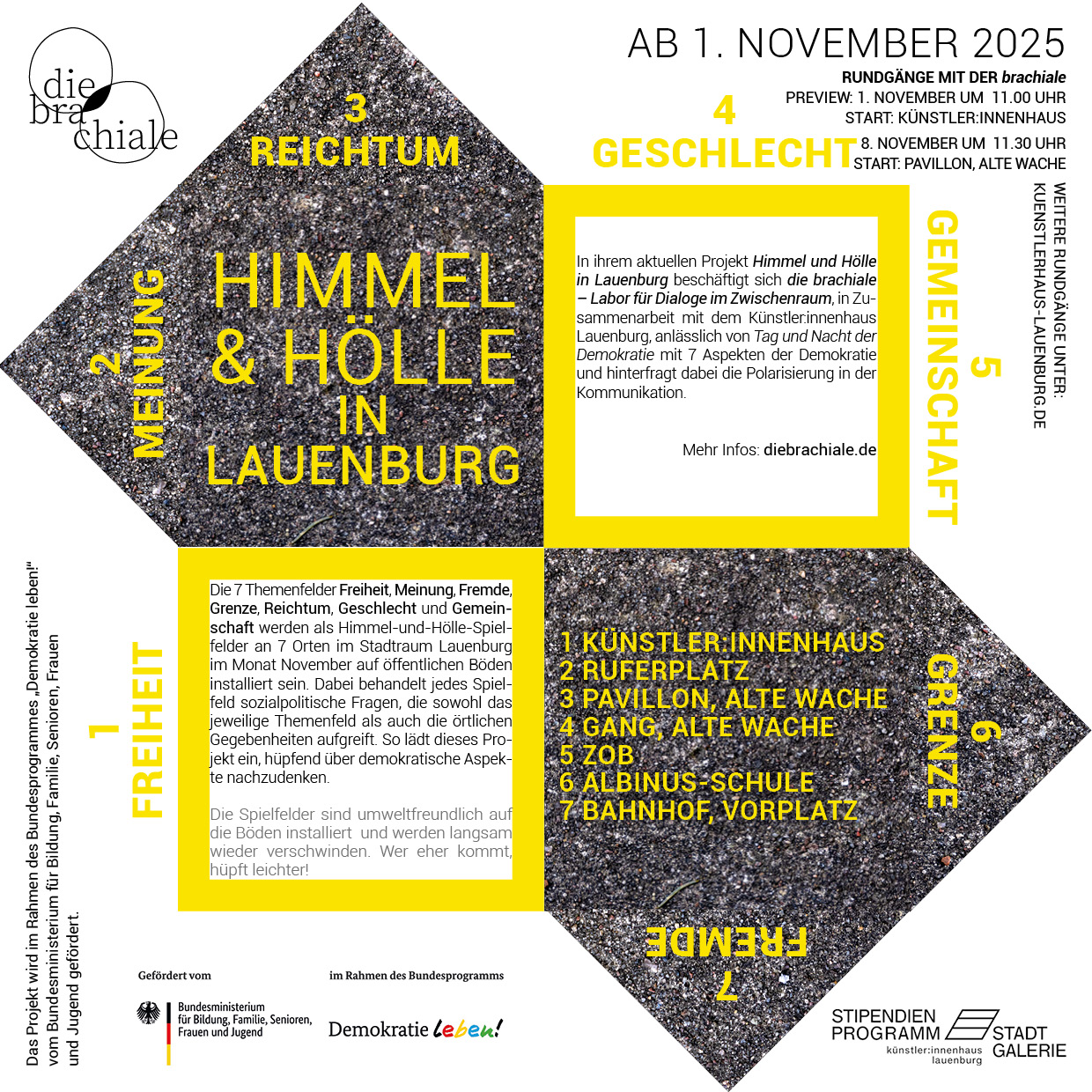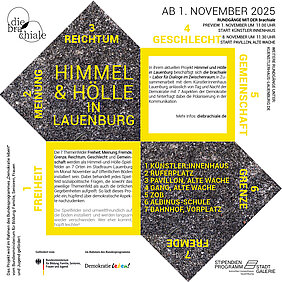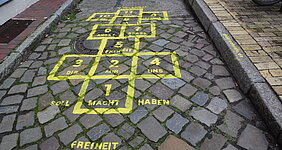 Das Künstler:innen-Haus Lauenburg setzte mit Berit Kröner und Mirja Schellbach vom Kollektiv „die brachiale – Labor für Dialoge im Zwischenraum“ ein interaktives Projekt im öffentlichen Raum in Lauenburg um. Die Künstlerinnen installierten sieben temporäre „Himmel-und-Hölle“-Spielfelder an verschiedenen Orten in der Stadt. Im gesamten November luden diese Spielfelder Passant:innen ein, sich mit zentralen Themen der Demokratie auseinanderzusetzen.