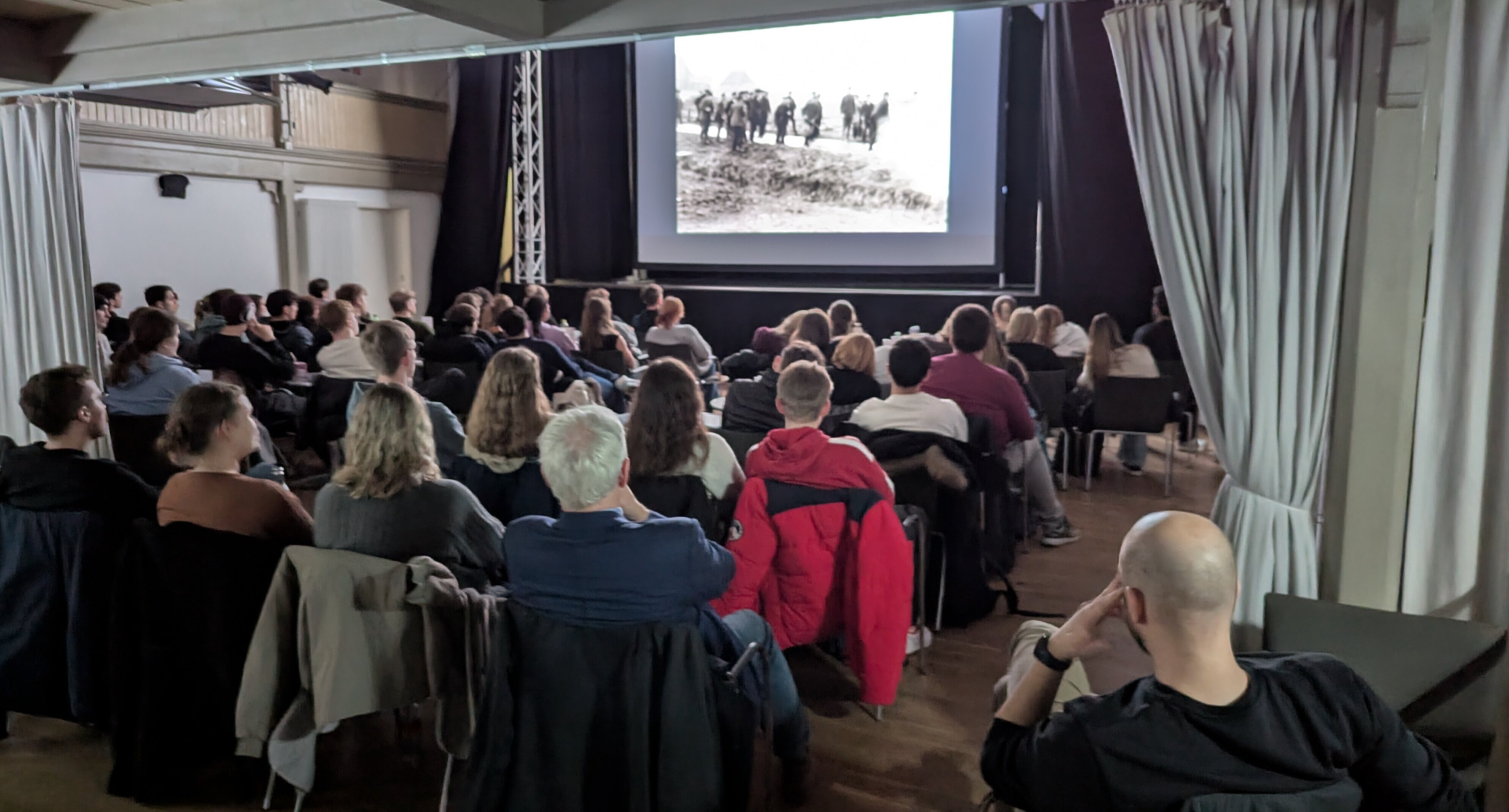 Die 46 Zuschauer:innen verfolgten ab 14:00 Uhr 95 Minuten lang gespannt die Landvolk-Bewegung auf der Leinwand der Osterwoldhalle.